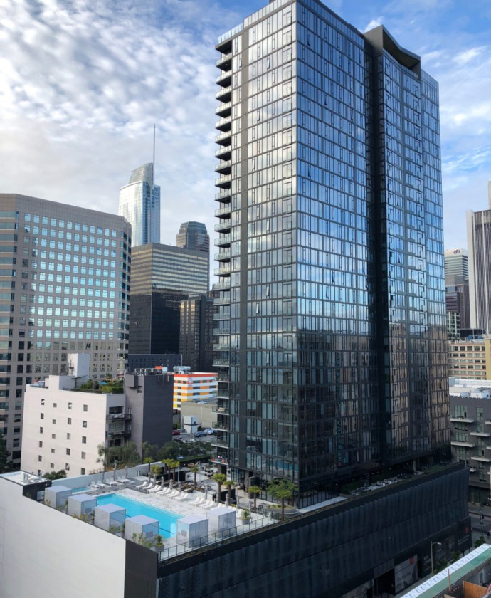 Glass-walled homes, designed by David Mann, are a study in proportion, light, and scale. Featuring a refined palette of natural materials, the open living spaces provide a warm counterpoint to the soaring ceilings.
